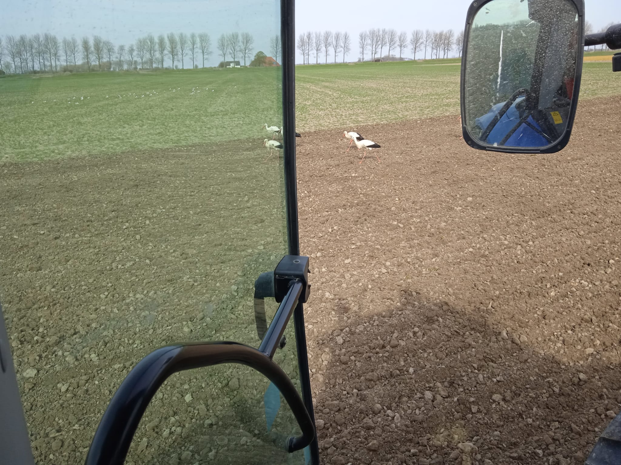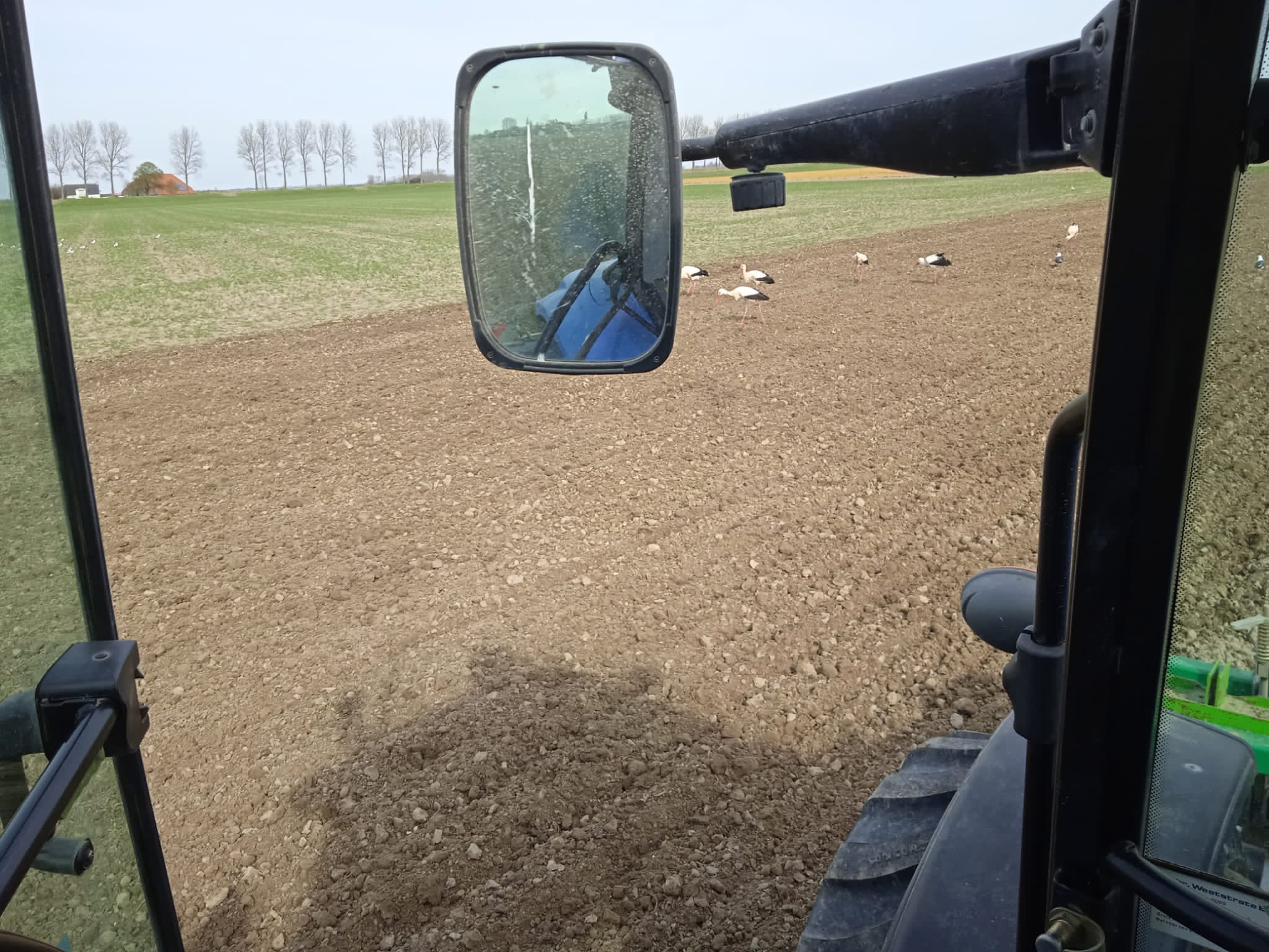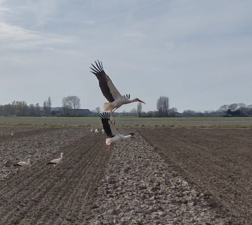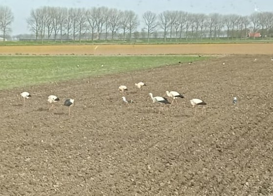 Wij waren de akker aan het bewerken om aardappels te poten toen er wel 15 ooievaars aan kwamen vliegen en landen op de akker, ze bleven rustig foerageren en hadden alle tijd.